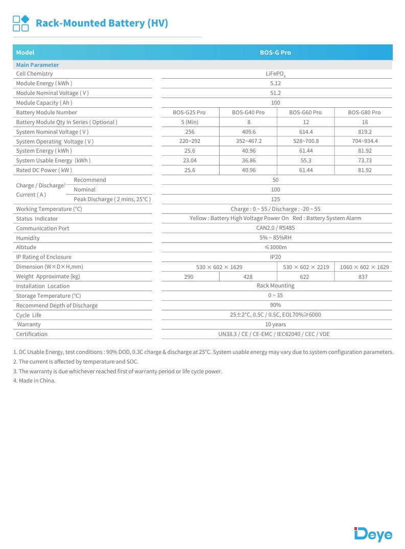 Das DEYE BOS-G Speichersystem ist eine fortschrittliche Energiespeicherlösung, die sich durch hohe Sicherheit, Flexibilität und Effizienz auszeichnet. Ausgestattet mit LiFePO4-Zellchemie bietet das System eine außergewöhnlich lange Lebensdauer und zuverlässige Leistung. Dank seines modularen Designs und flexiblen Spannungskonfigurationsmöglichkeiten ist das BOS-G ideal für private, gewerbliche und industrielle Anwendungen.