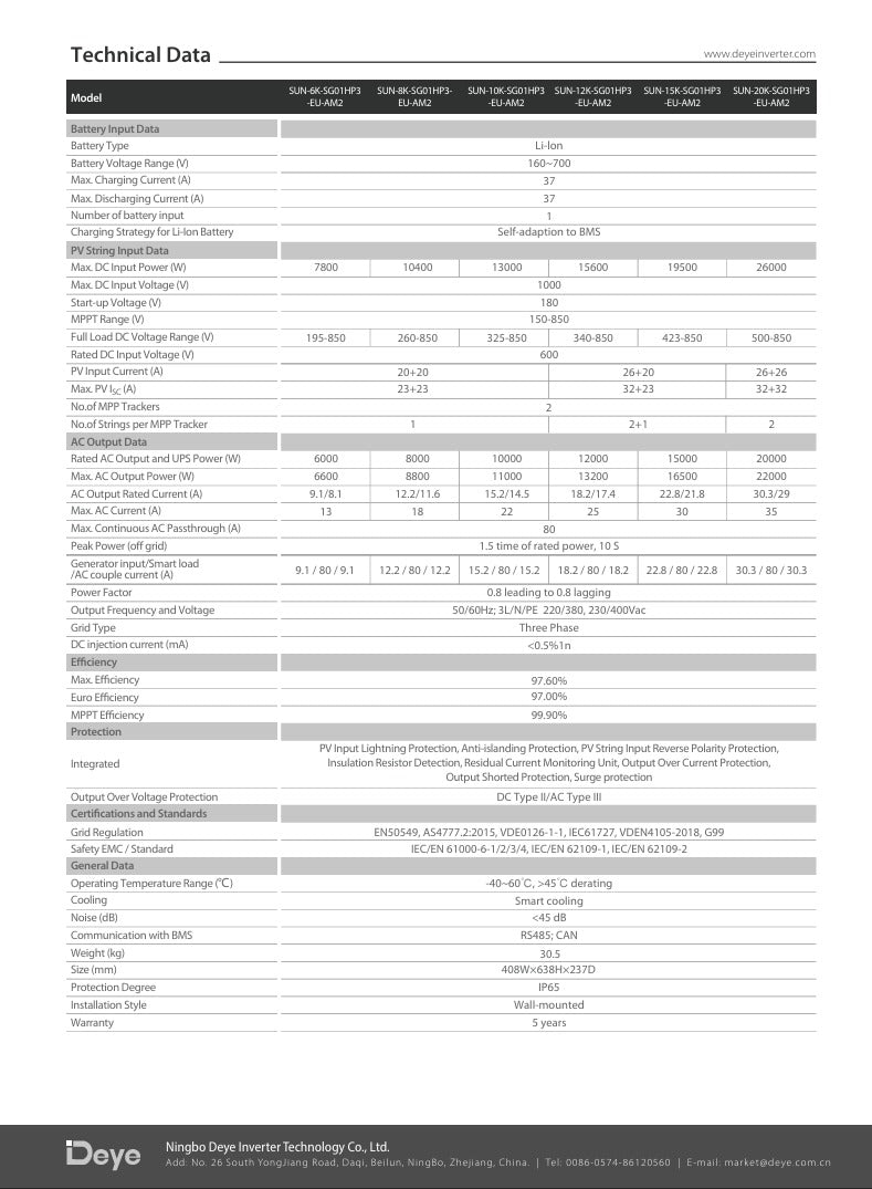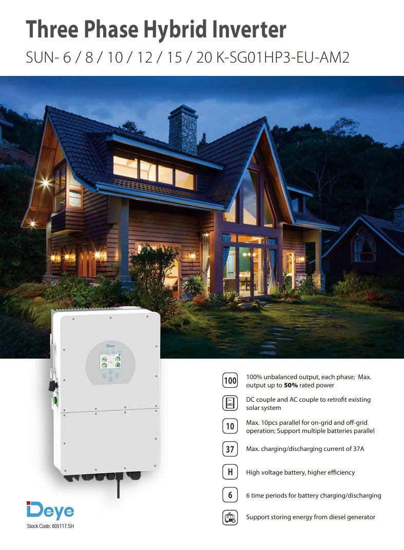 Die dreiphasigen Hybrid-Wechselrichter SUN-(5-25)K-SG01HP3-EU von Deye sind eine robuste, effiziente und vielseitige Lösung, die den steigenden Anforderungen moderner Solarstromsysteme gerecht wird.